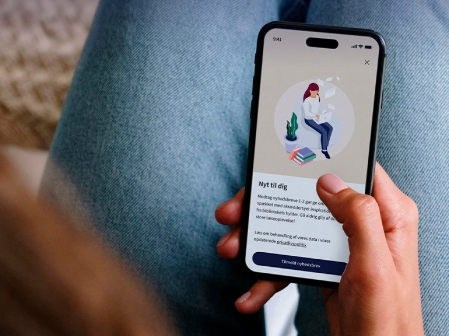 👉 Du får nu en pop-up om "Nyt til dig", hvor du kan trykke "Tilmeld nyhedsbrev". Her vil nyhedsbrevet blive sendt til den mail, du bruger på din lånerkonto. Den kan du tjekke eller ændre her.